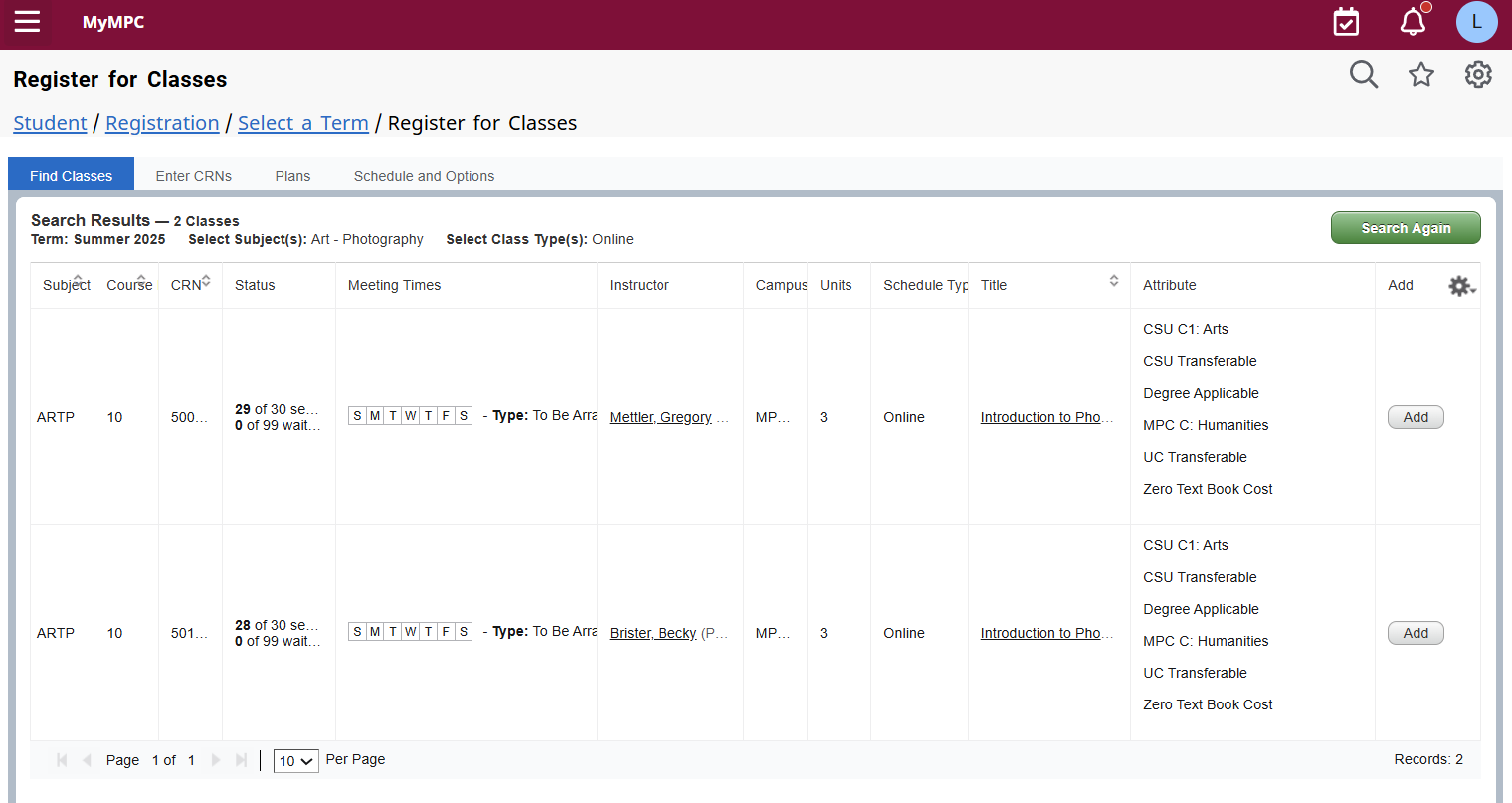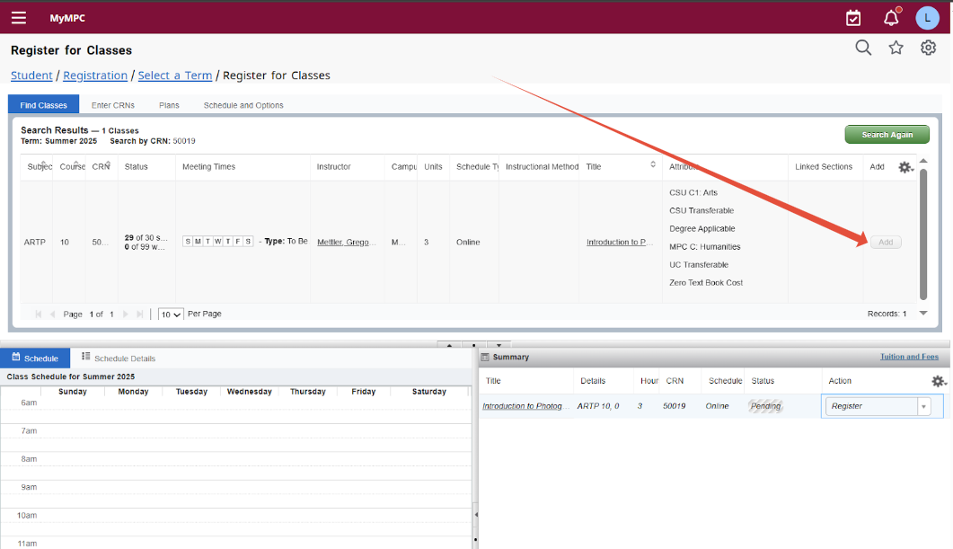 STEP 7: From the class search results page, click the “Add” button next to the course you wish to add to your schedule. The class will appear in a new window on the bottom right, the “Summary” section.