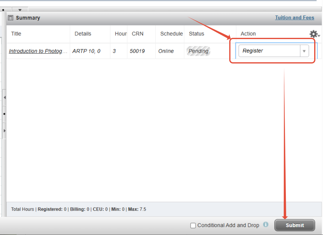 STEP 8: Select the action “Register” for the classes in the “Summary” section and click “Submit” at the bottom of the page.