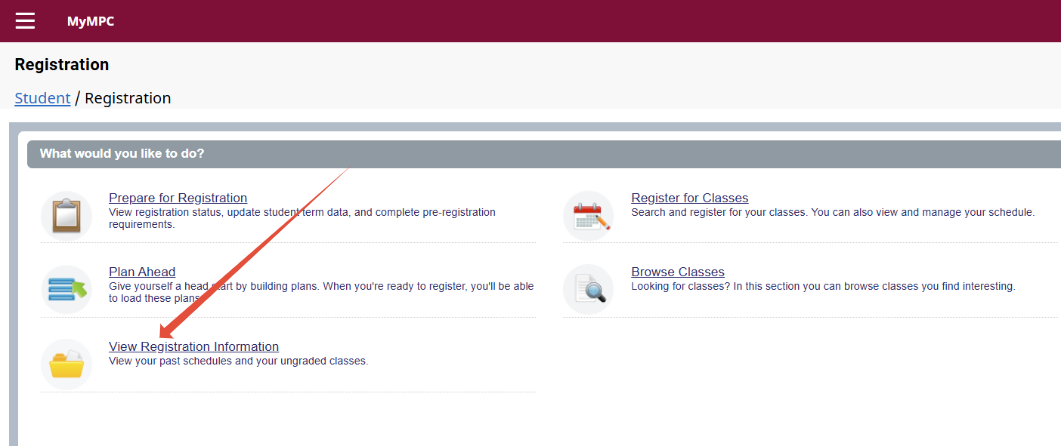 STEP 9: To view your class schedule, use the navigation at the top of the page to return to MyMPC and the “Registration Self-Service” card, or use the breadcrumbs to return to “Student”.