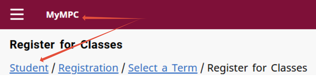 STEP 11: After registering for a class it is helpful to review your class schedule. To view your class schedule, use the navigation at the top of the page to return to MyMPC and the “Registration Self-Service” card, or use the breadcrumbs to return to “Student”.