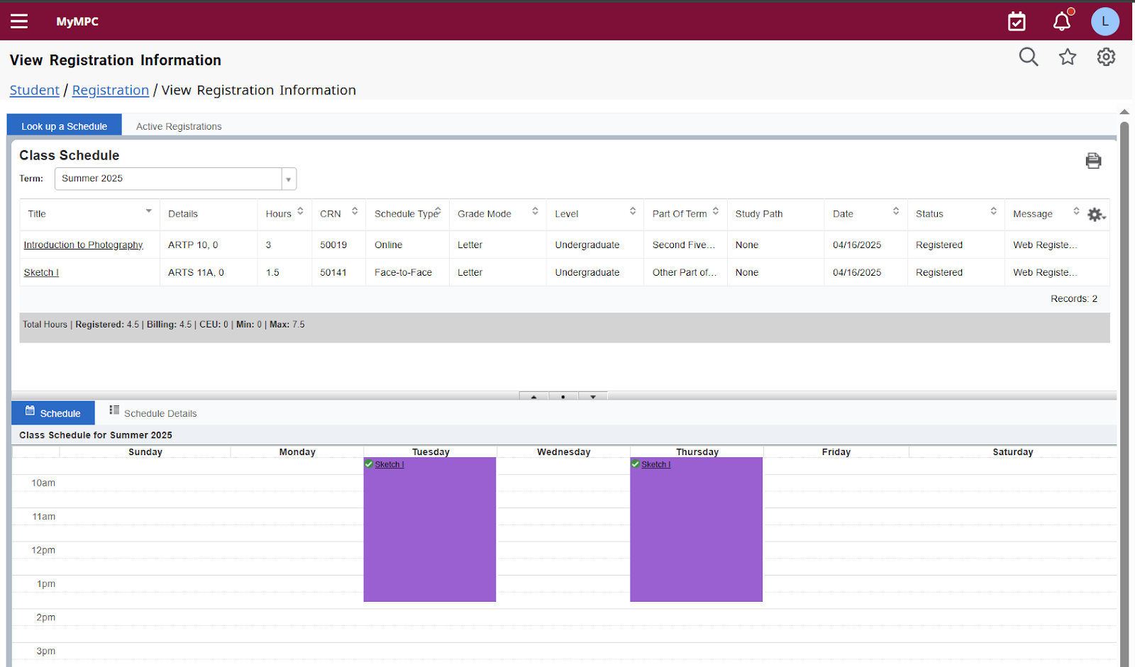 The “View Registration Information” page showcases any classes for which you are registered as well as a visual representation of class meeting times.