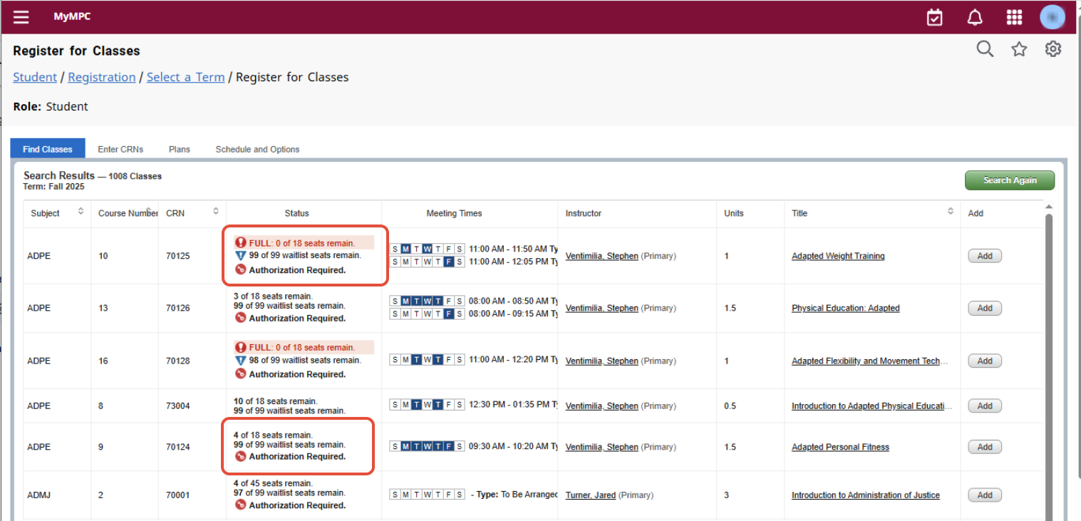 Class search results will display. When a class requires an add authorization code "Authorization Required" will be listed under the status of the course.