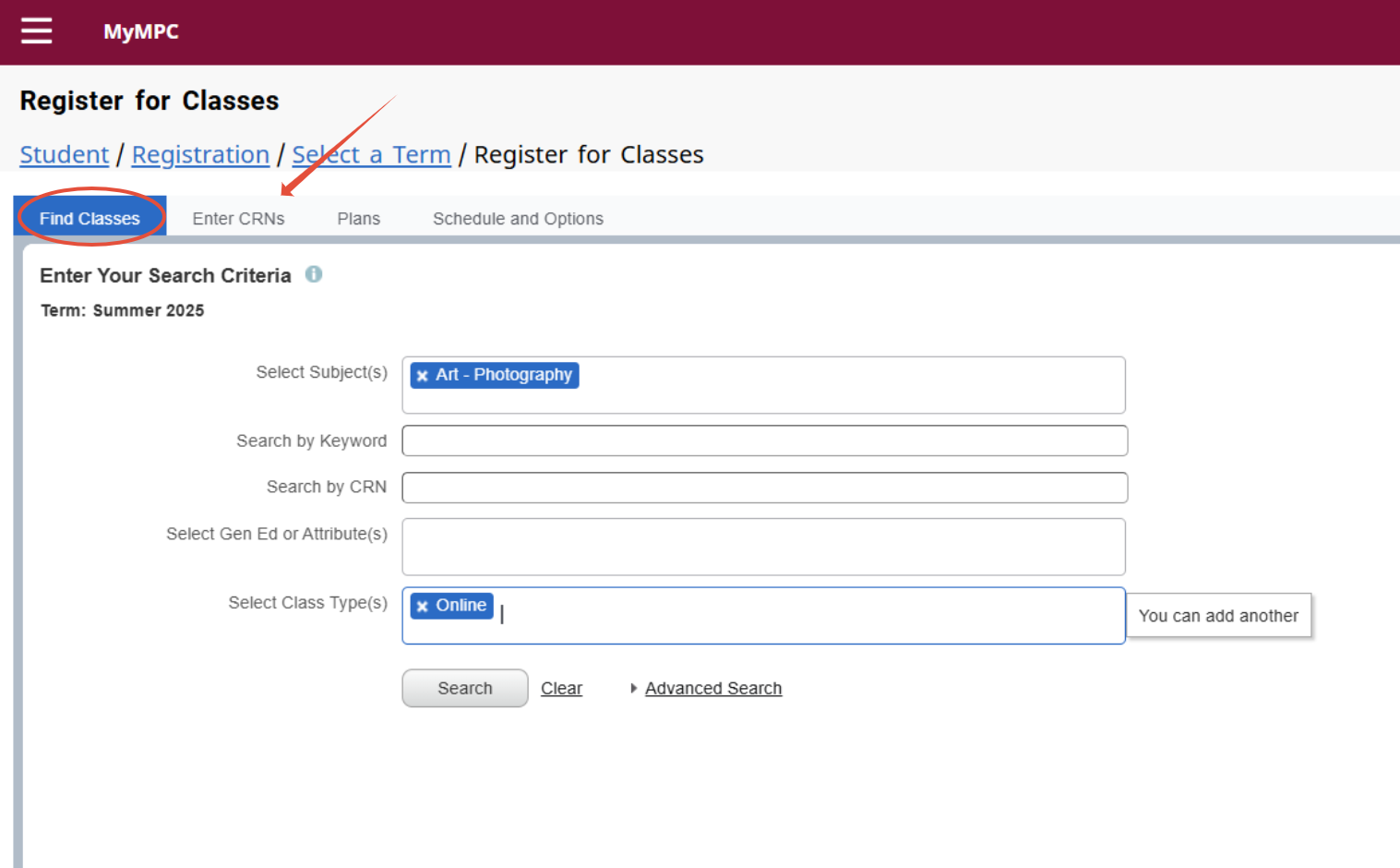STEP 6: From the “Find Classes” tab use the prompts to search the class schedule for classes or use the "Enter CRNs" tab if you already know the section numbers for your classes. For more information on how to search the class schedule, please view the “How Do I Browse the Class Schedule in MyMPC?” help desk article.