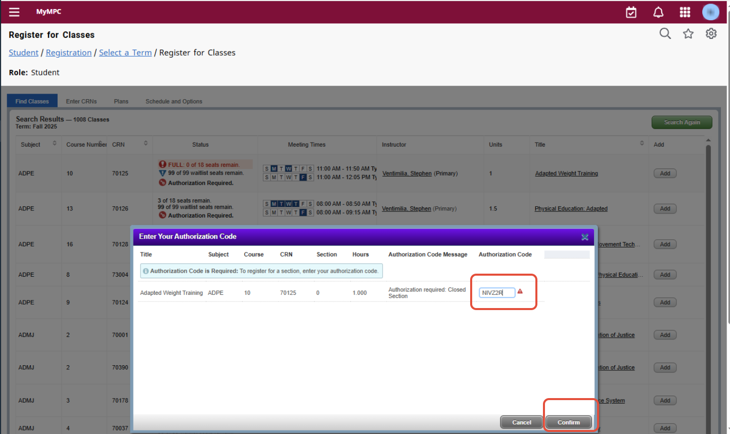 STEP 8: A window will appear. Enter the add authorization code obtained from your instructor in the "Authorization Code" field and click "Confirm" on the right hand side.