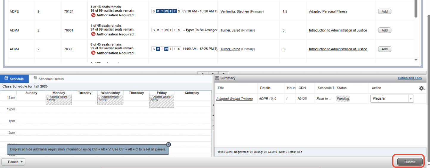 STEP 9: The class will show up in the "Summary" area in the lower right. Click "Submit" to register for the class.