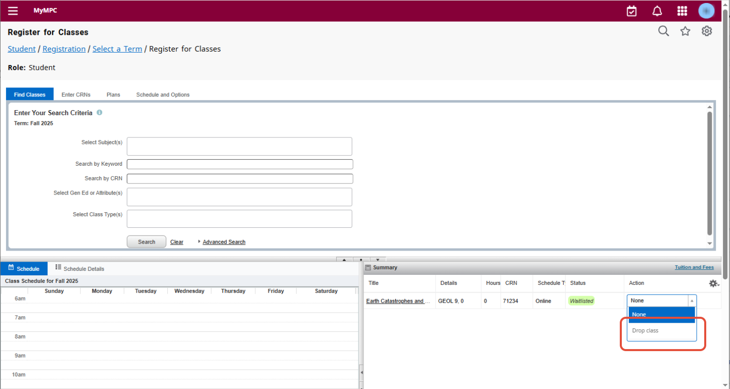 Important: After dropping from the waitlist, students must go back to the beginning of the registration process in order to add the class. Please click on "MyMPC" in the top left-hand corner and then on the "Registration Self-Service" card. Once on "Registration Self-Service" follow the prompts from the beginning of this guide to use add the class with an add code.